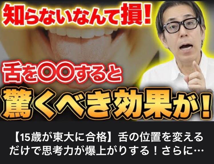 ・脳の活性化、思考力アップ:舌が上がることで鼻呼吸がスムーズになり、脳のオーバーヒートを防ぐ「冷却効果が生まれます。これにより、集中力や思考力が向上します。実際に15歳で東大に合格した事例でも、この舌の位置と鼻呼吸の重要性が語られています。